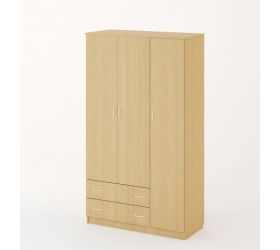Трехстворчатый шкаф с выдвижными ящиками. Шкаф состоит из трех секций: одна оснащена полкой и штангой, вторая пятью нишами, третья двумя выдвижными ящиками. Такой шкаф идеально подойдет для размещения как одежды и белья, так и постельных принадлежностей.