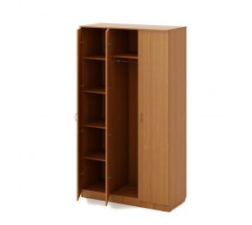 Трехдверный шкаф состоит из двух секций: одна оснащена полкой и штангой, вторая пятью нишами. Шкаф очень вместительный и отлично подойдет для спальни, прихожей или гардеробной